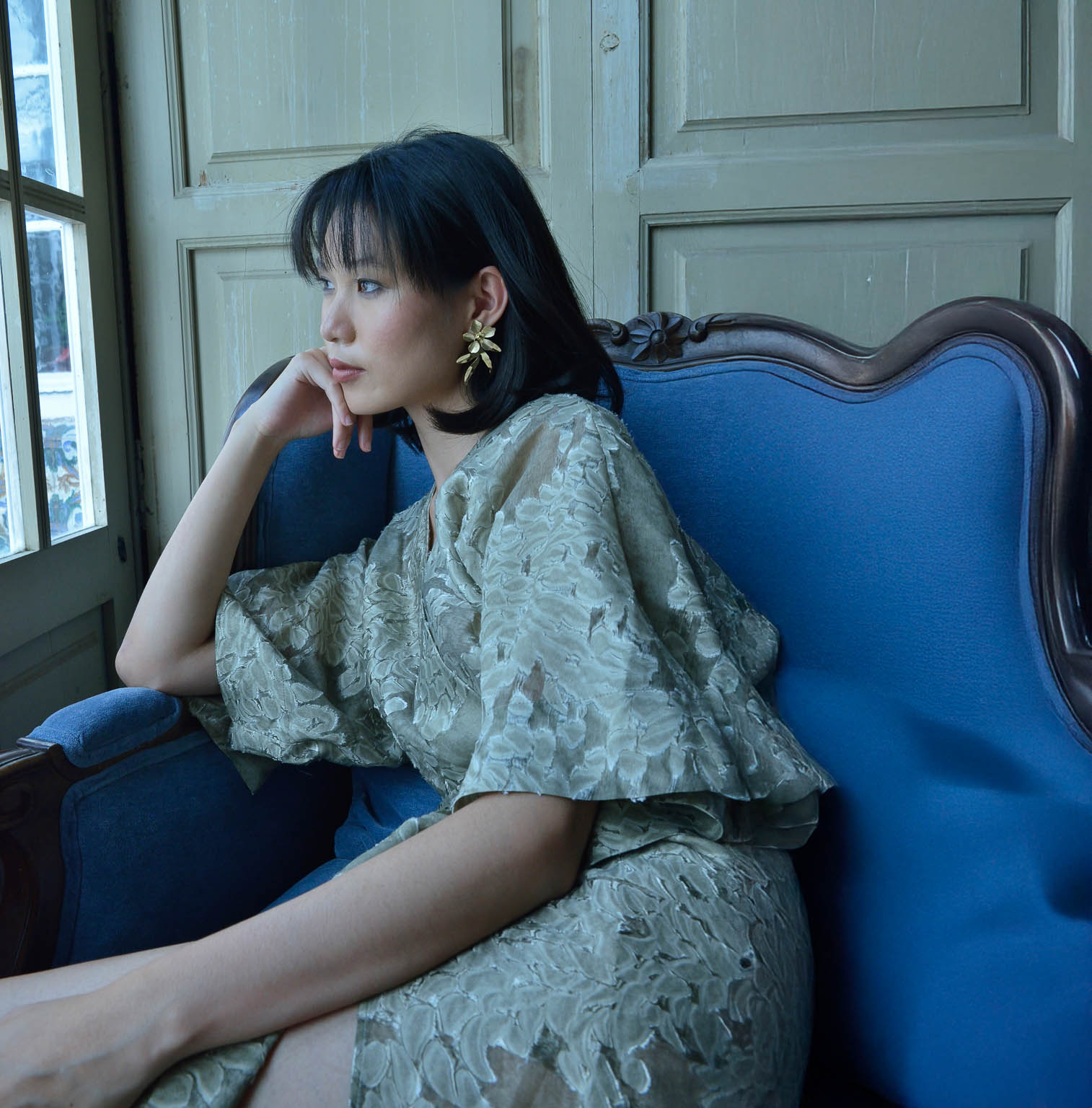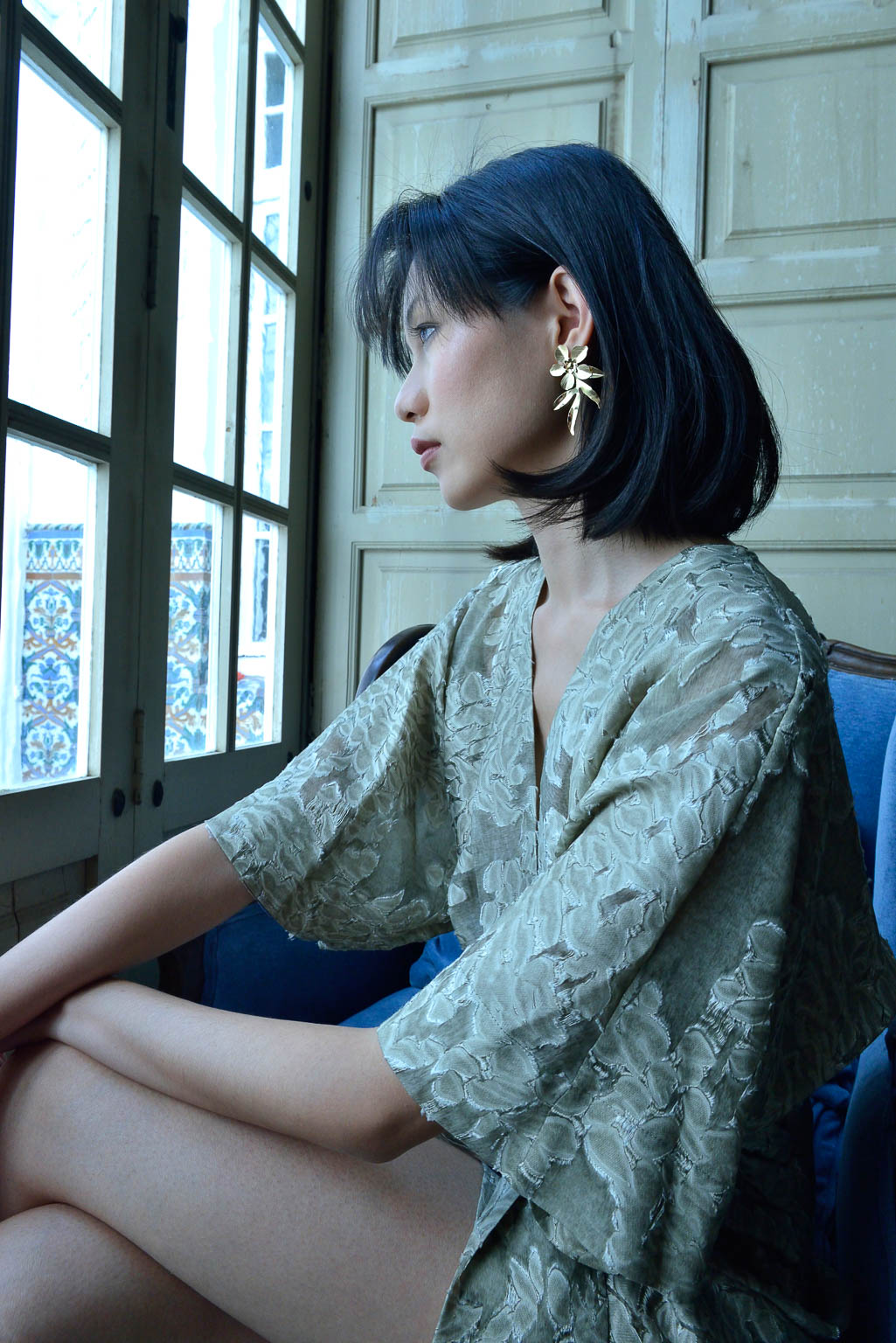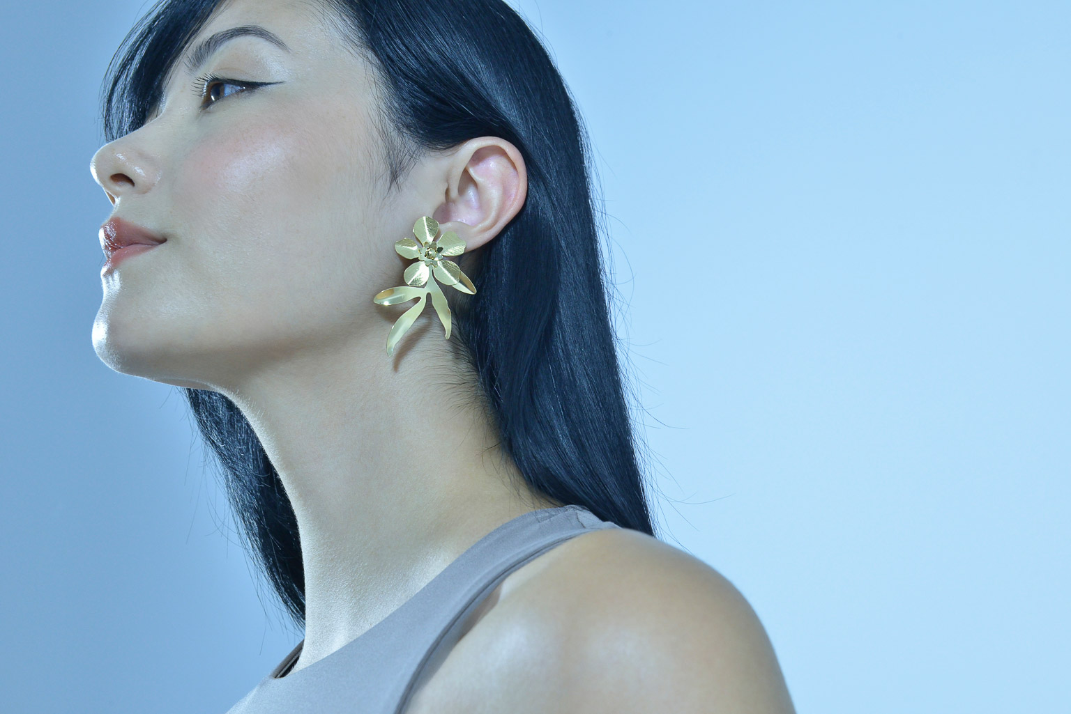 PENDIENTES PLATA CHAPADO DORADO FLOR PETALOS DIAMANTADOS HOJAS LISASSIZE: 6 X 3.50