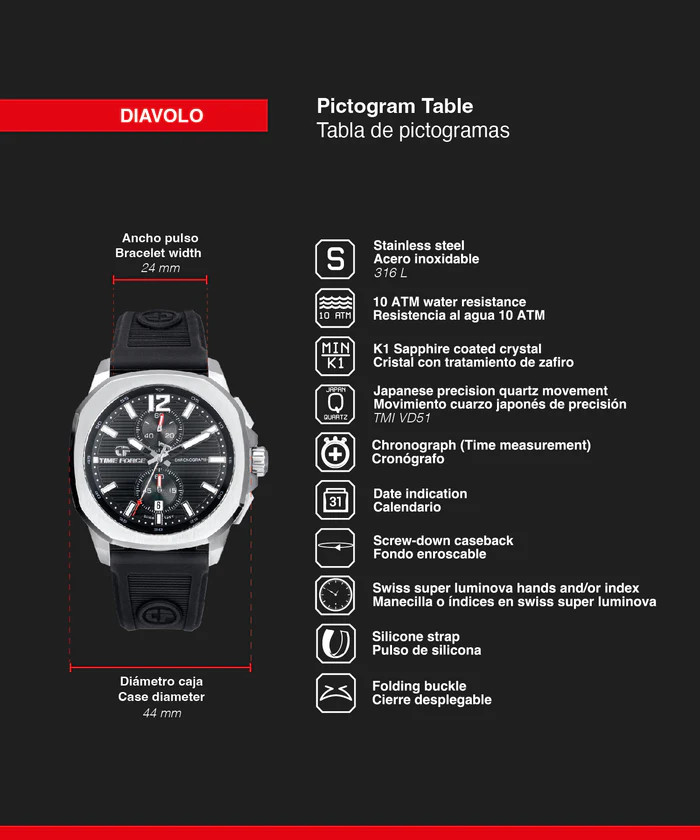 Con el movimiento de cuarzo japonés TMI VD51, el Diavolo ofrece una precisión inigualable, ideal para quienes no dejan nada al azar y valoran cada segundo. Un reloj que se mueve al ritmo de tu vida, brindándote la precisión que necesitas para afrontar cada momento.