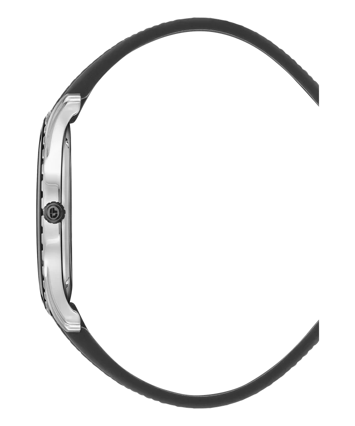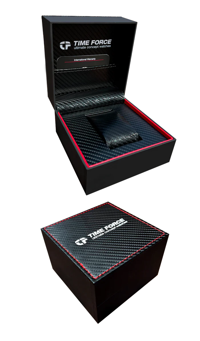 Con una caja de 6 mm de grosor y un cristal abovedado, Time Force ofrece una propuesta de valor innegable que destaca por su calidad y atención al detalle. La pulsera de silicona, por ejemplo, y la esfera presentan un acabado estilo fibra de carbono, que refleja el espíritu deportivo que define el corazón histórico de Time Force.